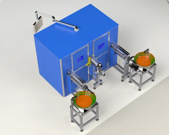 This system has been specially developed for the laser welding of cylindrical solid metal rods. An automated conveyor system with vibratory spiral conveyors ensures precise alignment and feeding of the parts before they are welded together. The welding process is monitored and analyzed with camera support, so that the parts are sorted directly into good and bad parts.